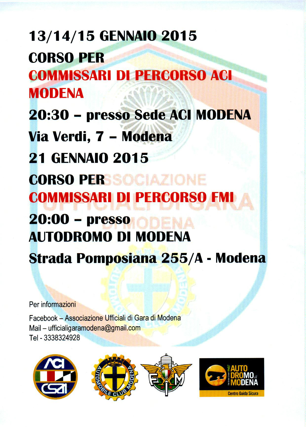 Presso la Sede dell' Automobile Club Modena, nei giorni 13/14/15 Gennaio 2015 si terrà il corso per COMMISSARI DI PERCORSO ACI MODENA